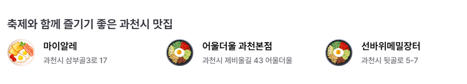 렛츠런파크 서울 근처에는 과천 서울랜드와 국립과천과학관 같은 관광 명소가 있어 함께 방문하기 좋습니다. 또한, 다양한 한식당들이 위치해 있으며, 대표적으로 봉덕칼국수와 더차돌 같은 맛집에서 현지 음식을 즐길 수 있습니다. 이 명소들은 렛츠런파크 방문 후 가볍게 둘러보기 좋은 장소들입니다.